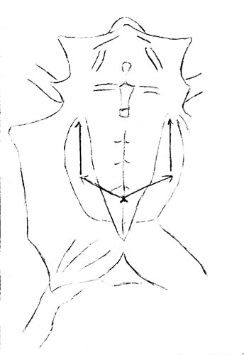 Le tube digestif qui comprend l’œsophage (ne peut être vu qu’en soulevant les lobes du foie), il se dilate en une poche allongée : l’estomac. L’intestin lui faite suite.