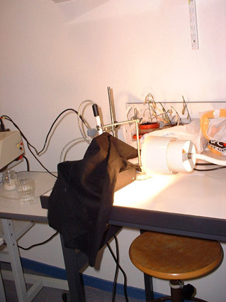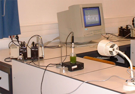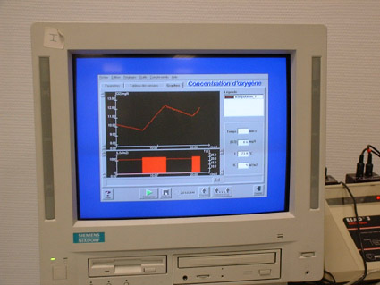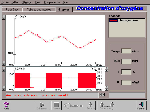 L’enceinte possède trois capteurs : capteur lumière ( éclairement) capteur température et capteur oxymètre ( concentration de dioxygène). L’ordinateur permet une mesure du temps et produit trois graphes (T°C=f(temps),Ecl=f(temps) et [02]=f(temps).