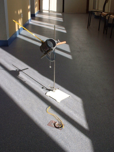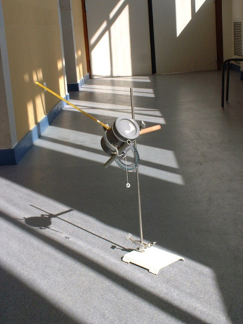 On installe le dispositif au soleil, de telle manière que les rayons du soleil pénètrent parallèlement à l’axe du cylindre. Pour cela on vérifie que le socle de la potence est bien parallèle au cylindre puis grâce à la boussole on le place dans la direction du soleil . Pour vérifier on utilise une feuille de papier que l’on place derrière le petit cylindre de visée |
