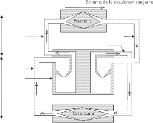 | Q 2 : Compte tenu de la disposition des valvules, quel est le sens de circulation du sang quand la pompe cardiaque se met en mouvement ? Q 3 : Compte tenu du sens de circulation du sang et des propriétés de l'hémoglobine, quelle seront les couleurs du sang dans les différents vaisseaux (utiliser les deux couleurs conventionnelles sur le schéma : rouge et bleu, mettez une légende. Q 4 : Indiquez sur le schéma de circulation le nom des principaux vaisseaux. |