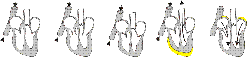 | Le document donne l'évolution des pressions dans le ventricule gauche, l'aorte, l'oreillette gauche, au cours du cycle cardiaque. Q 5 : Connaissant la disposition des valvules et les pressions dans les différents compartiments du cœur, indiquez sur le tableau la position des valvules cardiaques aux différents moments du cycle. Q 6 : Découpez les schémas de cœur et les placer dans le bon ordre sous le tableau. |