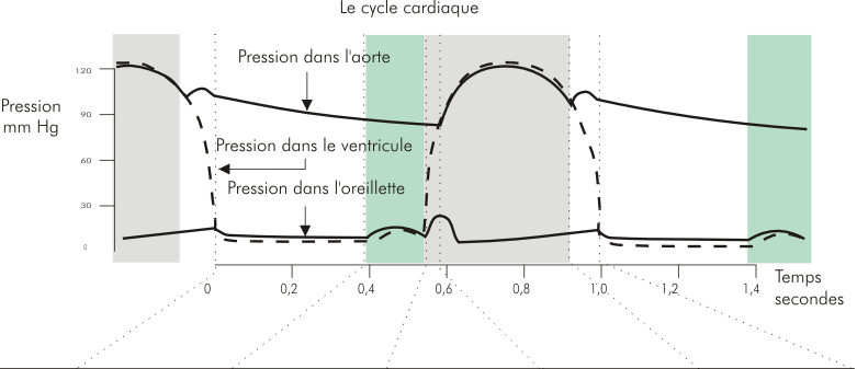 | Phase | Diastole ventriculaire et auriculaire | systole auriculaire | Contraction isovolumétrique | Ejection ventriculaire | Relaxation isovolumétrique Diastole Ve et Au | |||||||