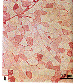 Mise en évidence du glycogène dans des cellules musculaires avant et après l'effort. La présence de glycogène se traduit par une coloration violette.(document livre de premiere S Hatier)