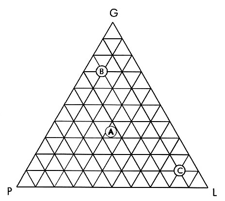 Q 1 : sur le triangle sont portés trois points A B C . Trouver les proportions G P L correspondant à ces trois points.